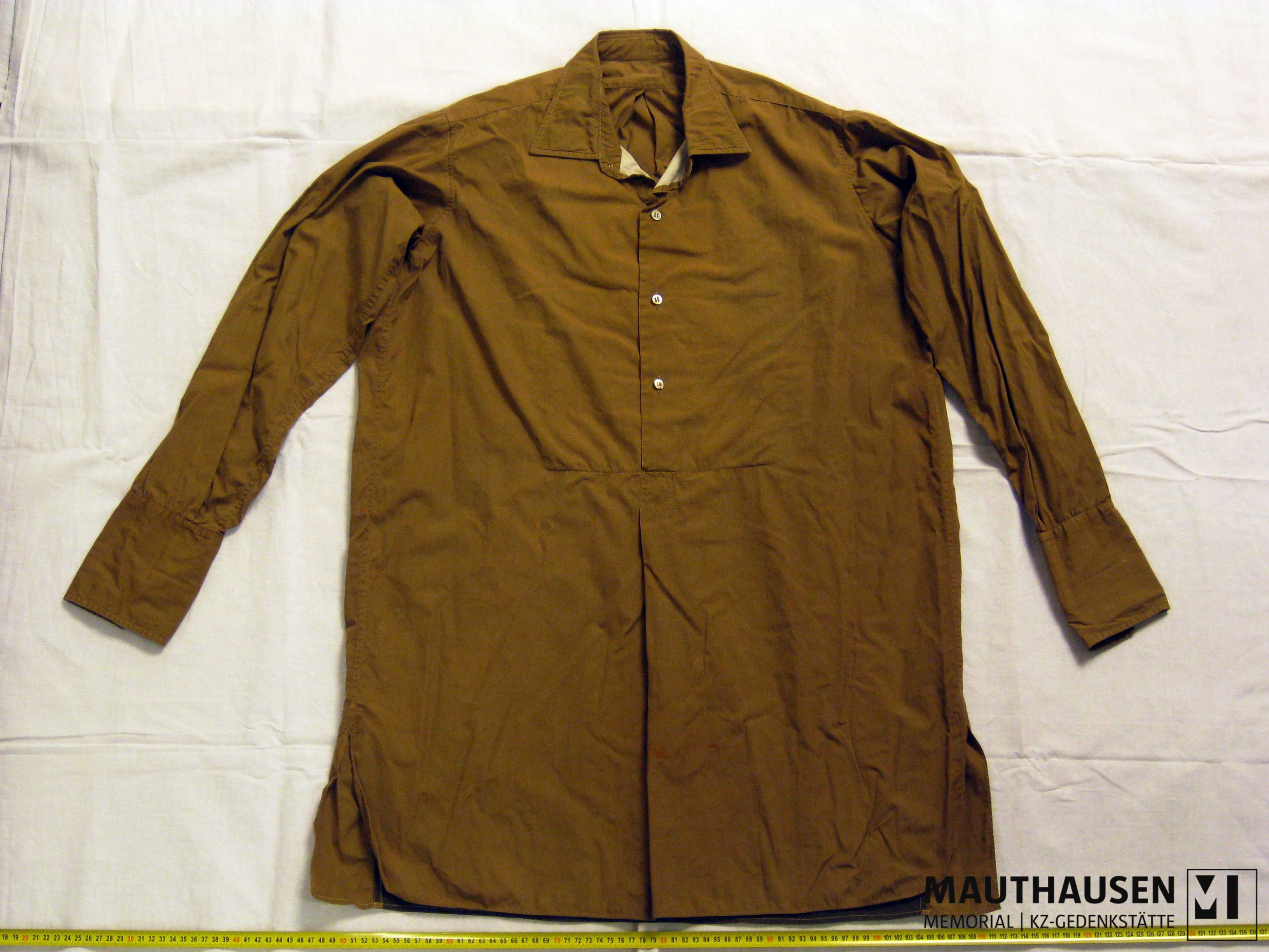 DescriptionNotiz auf säurefreien Papier, mit dem die Objekte abgedeckt waren: Ankauf unter W. Soucek (angeblich Teile einer SA-Uniform) Hemd/Krawatte/Gürtel. --> WeiterRecherche notwendig (in Kanzlei?!). Stoffetikett mit Inv.Nr. angenäht!