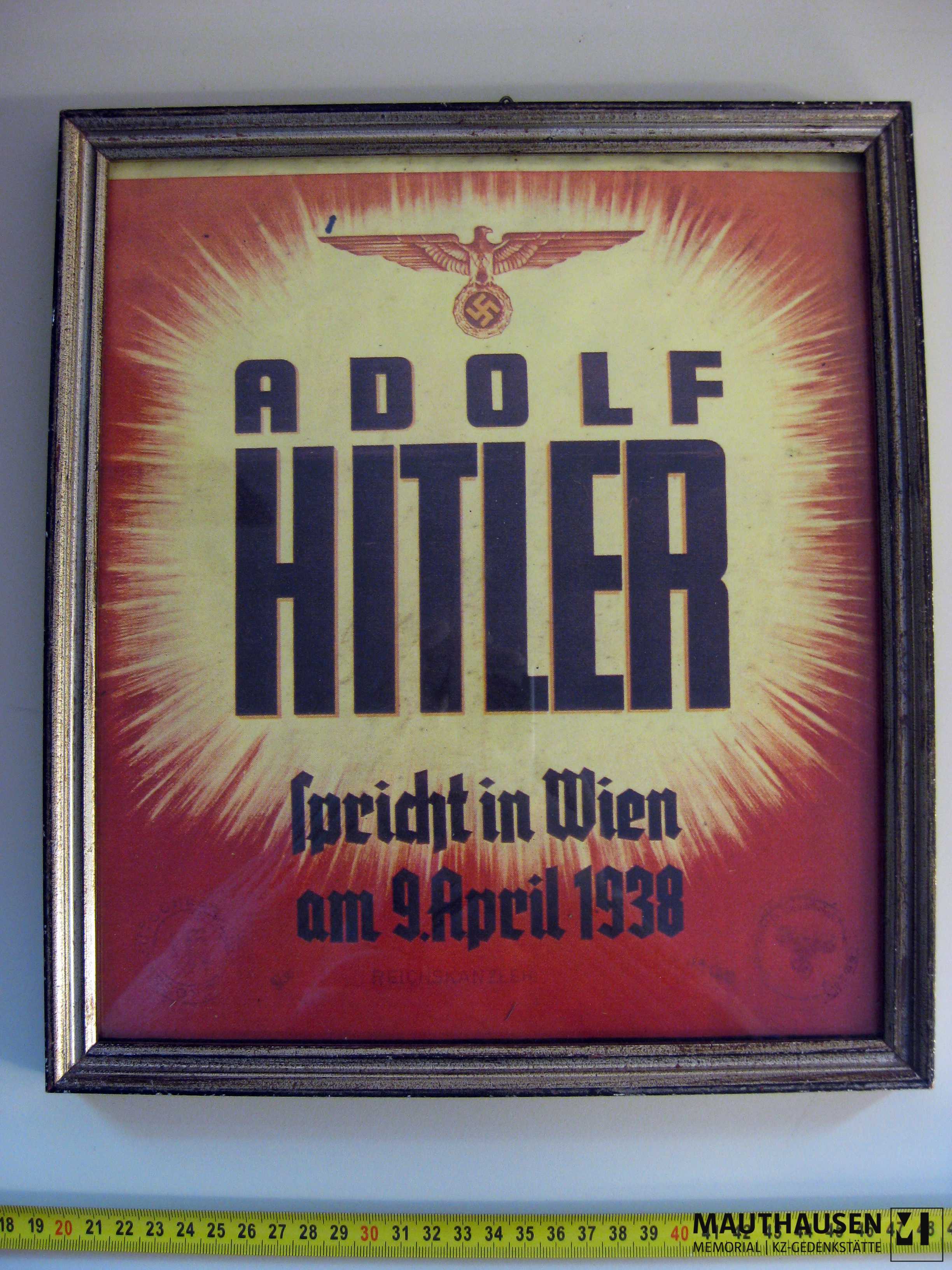 DescriptionPropagandaplakat gerahmt; Schriftzug "ADOLF HITLER spricht in Wien am 9. April 1938"; 5 Stempel (teilweise schwer leserlich): "REICHSKANZLER", "GROSSDEUTSCHESREICH", "1938"; Rahmen : Holz, Original aus der Zeit?, Schriftzug in Bleistift "mater amalele"(?); auf Rahmenrückseite: Portrait einer/eines Unbekannten auf der Bilderrahmen-Rückwand in Ölfarben(?)