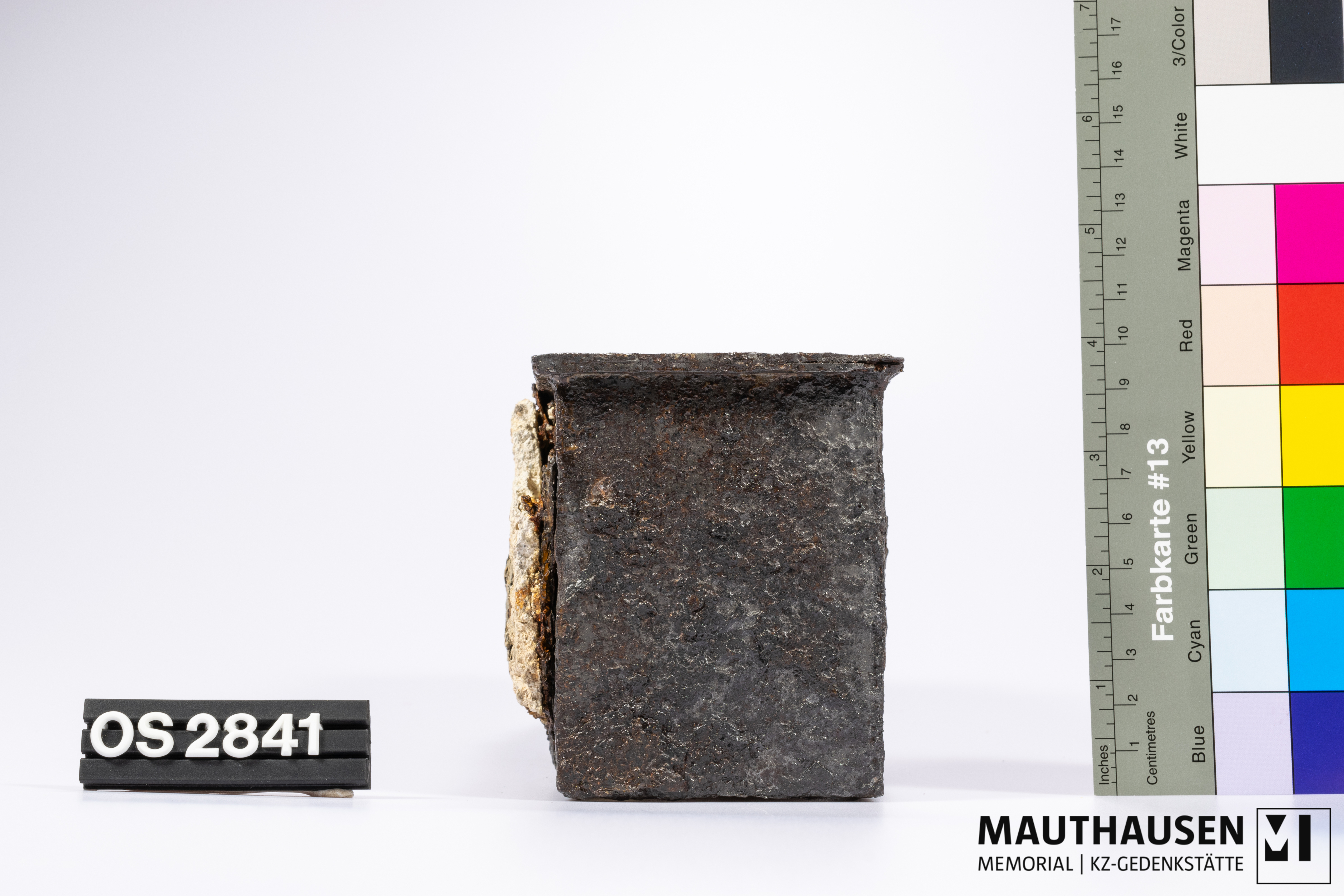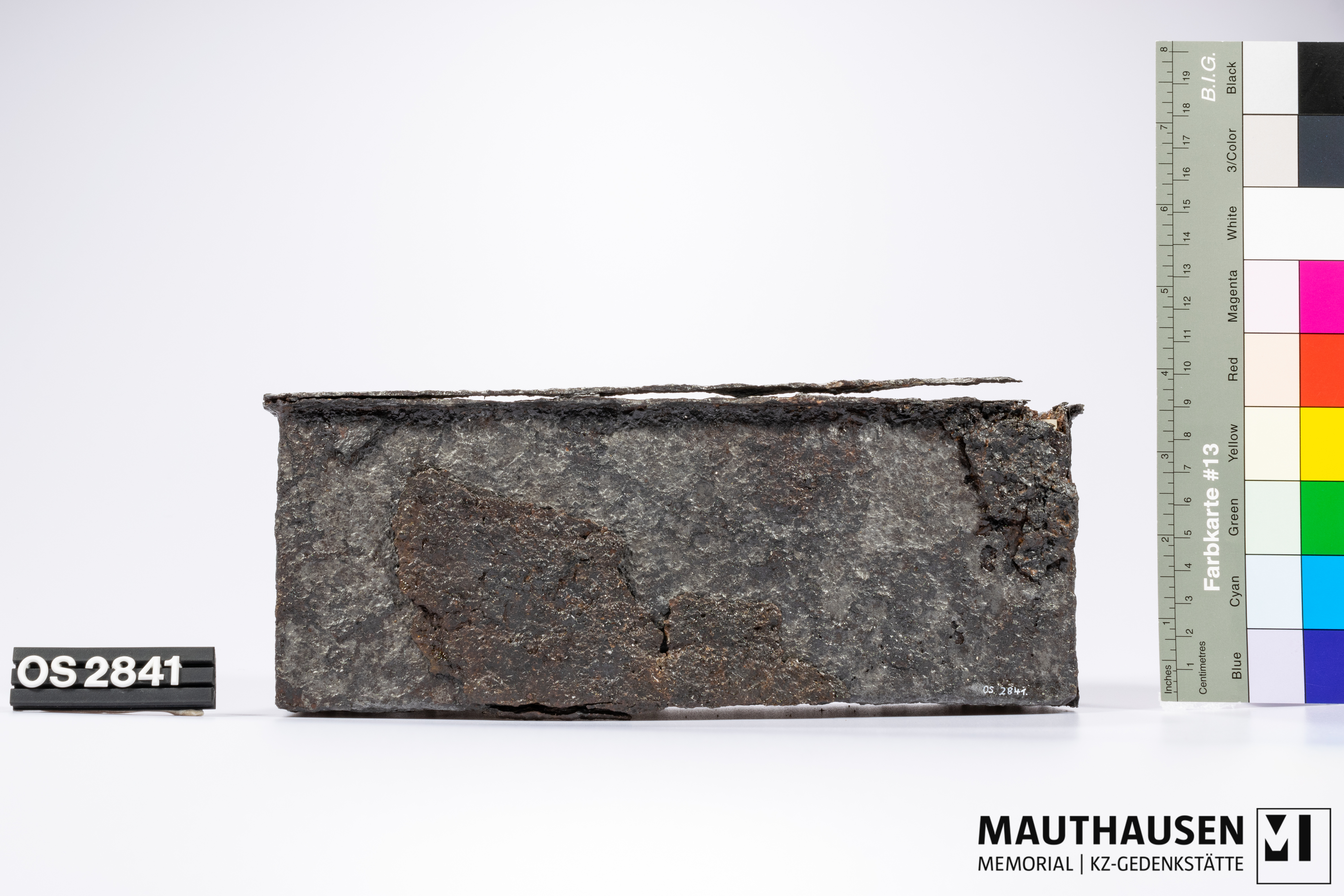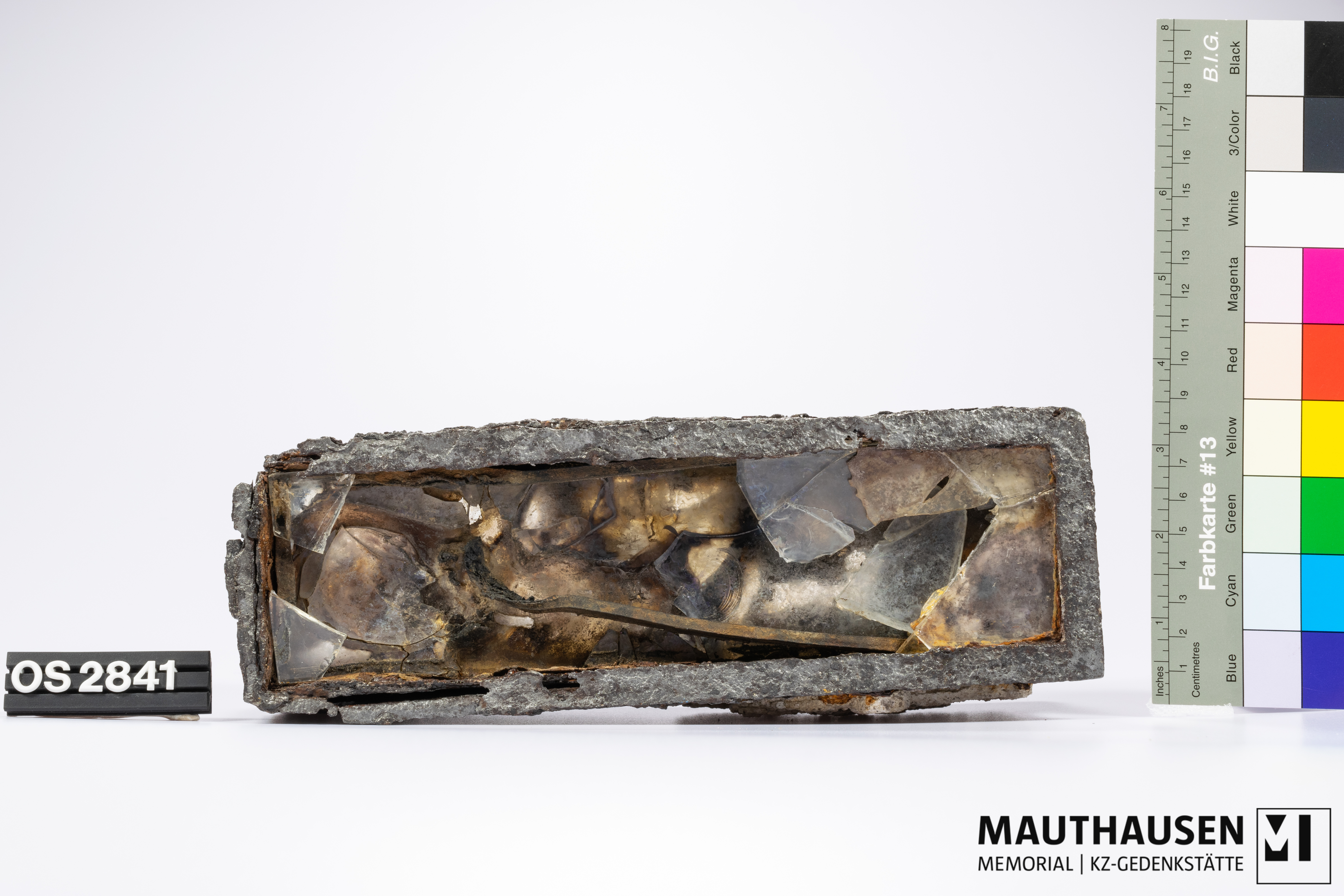 Descriptionunbestimmbares Metallobjekt; rechteckig, auf einer Außenseite Putzreste einer Mauer; 11mm breite Umrandung auf der Oberseite; innen dicke Glasscheiben, fragmentarisch erhalten; mehrere Schichten Glas, dazwischen Folie angebracht; im Zwischenraum rundherum verlaufende Dichtungselemente aus Gummi; Unterseite Glasboden, fragmentiert;