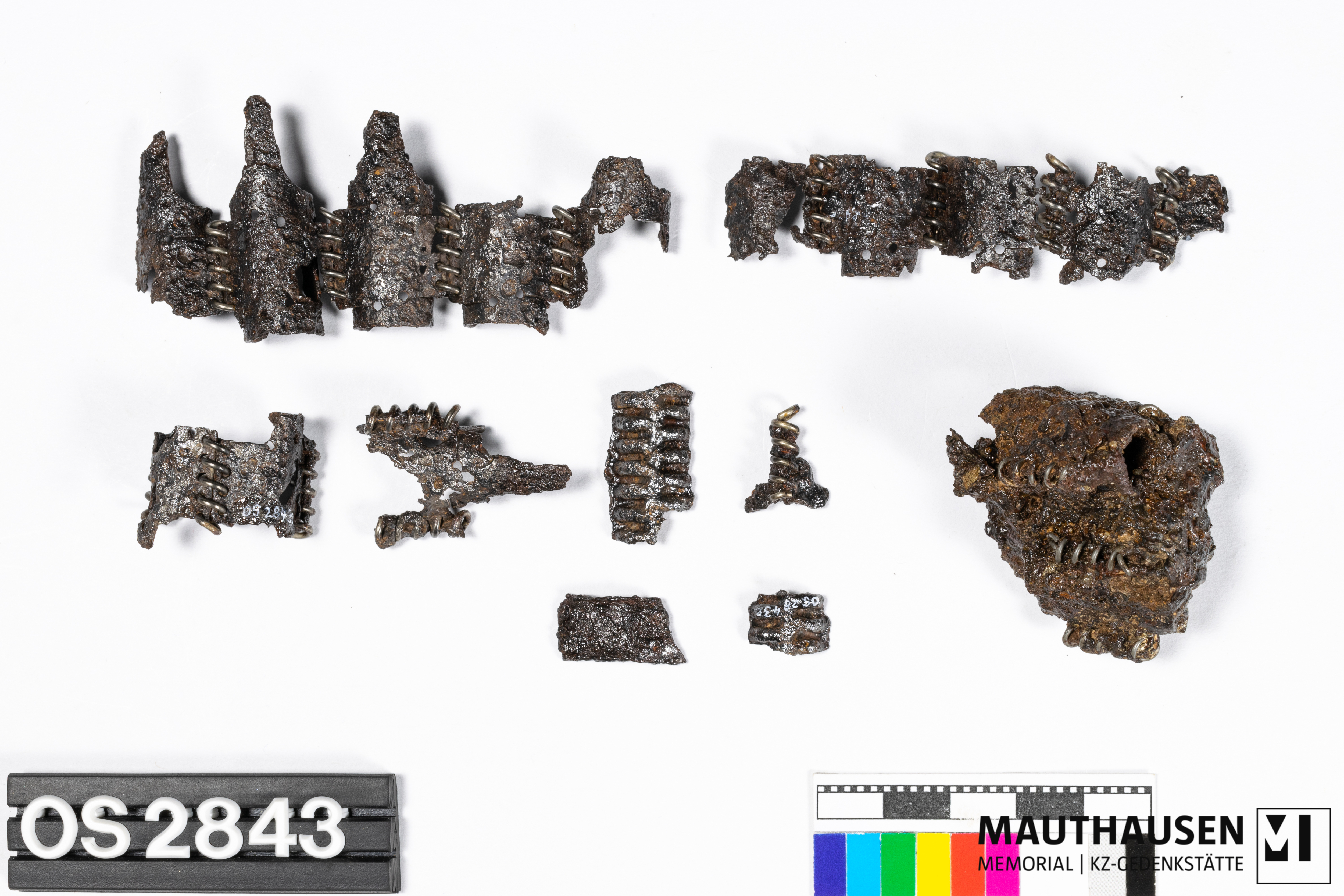 DescriptionMunitionsgurt, fragmentiert; Teilung OS-Nr. in a, b, c, d, e, f; Munitionshalterungen rund, auf Rückseite geöffnet, nach oben schmal zu einer abgeflachten Spitze verlaufend; Elemente mit gewundenem Eisen verbunden; OS2843a: 5 Glieder, OS2843b: 4 1/2 Glieder, OS2843c: 3 Glieder, OS2843d: 1 Glied, OS2843e: 4 Fragmente eines Glieds; OS2843f: Klumpen mehrerer zusammenkorrodierter Glieder und Elemente; weitere Fragmente extra beigelegt (nicht inventarisiert)