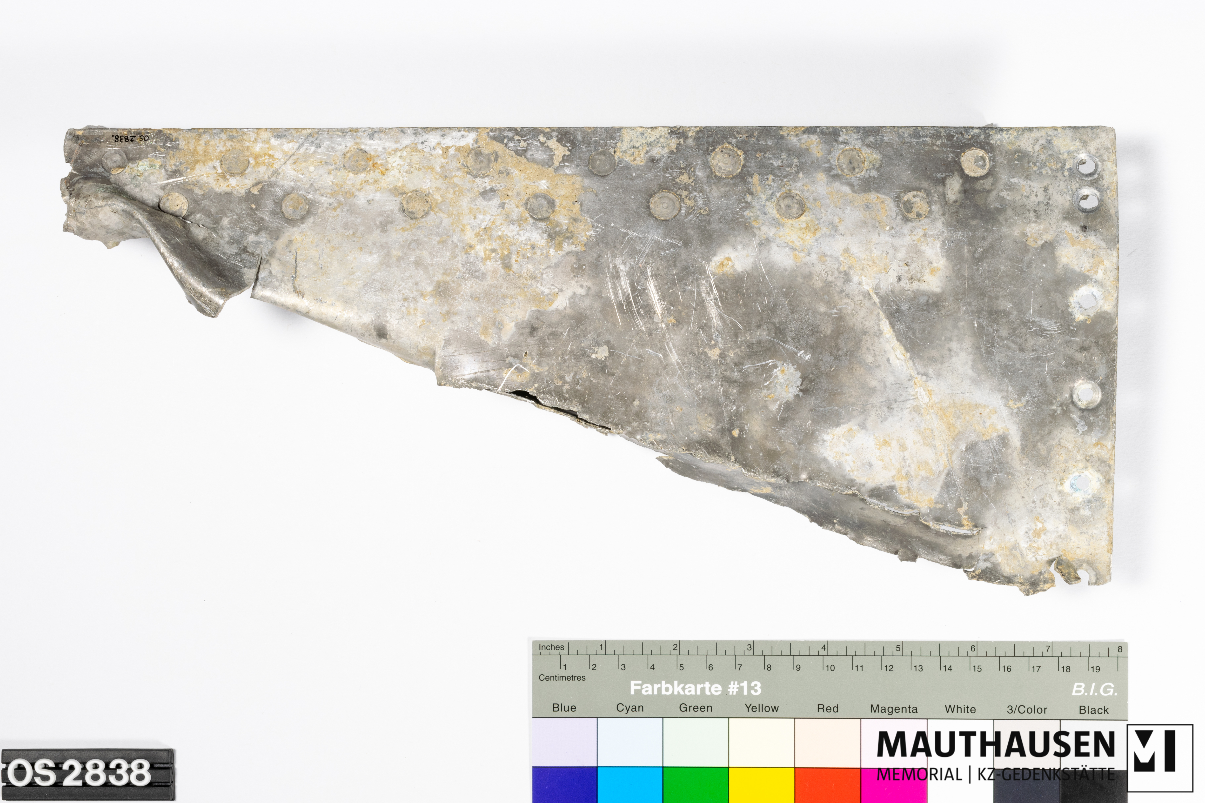 DescriptionBlech, fragmentiert; 5 Löcher auf der rechten Seite (vom Objekt aus gesehen); Spuren einer Blechschere erkennbar, abgeschnittene Elemente, ausgefranste Schnittkanten; Einschnitte auf der schrägen Oberkante; Blech bei Schnittlinie umgebogen; befestigtes Winkelblech, mit 15 Schrauben angehängt; bei Winkel schwarze Beschriftung, teils unter den Schrauben; schwer lesbar, "UNION", "15"; Schriftzug über die ganze Längsseite, unterstrichen