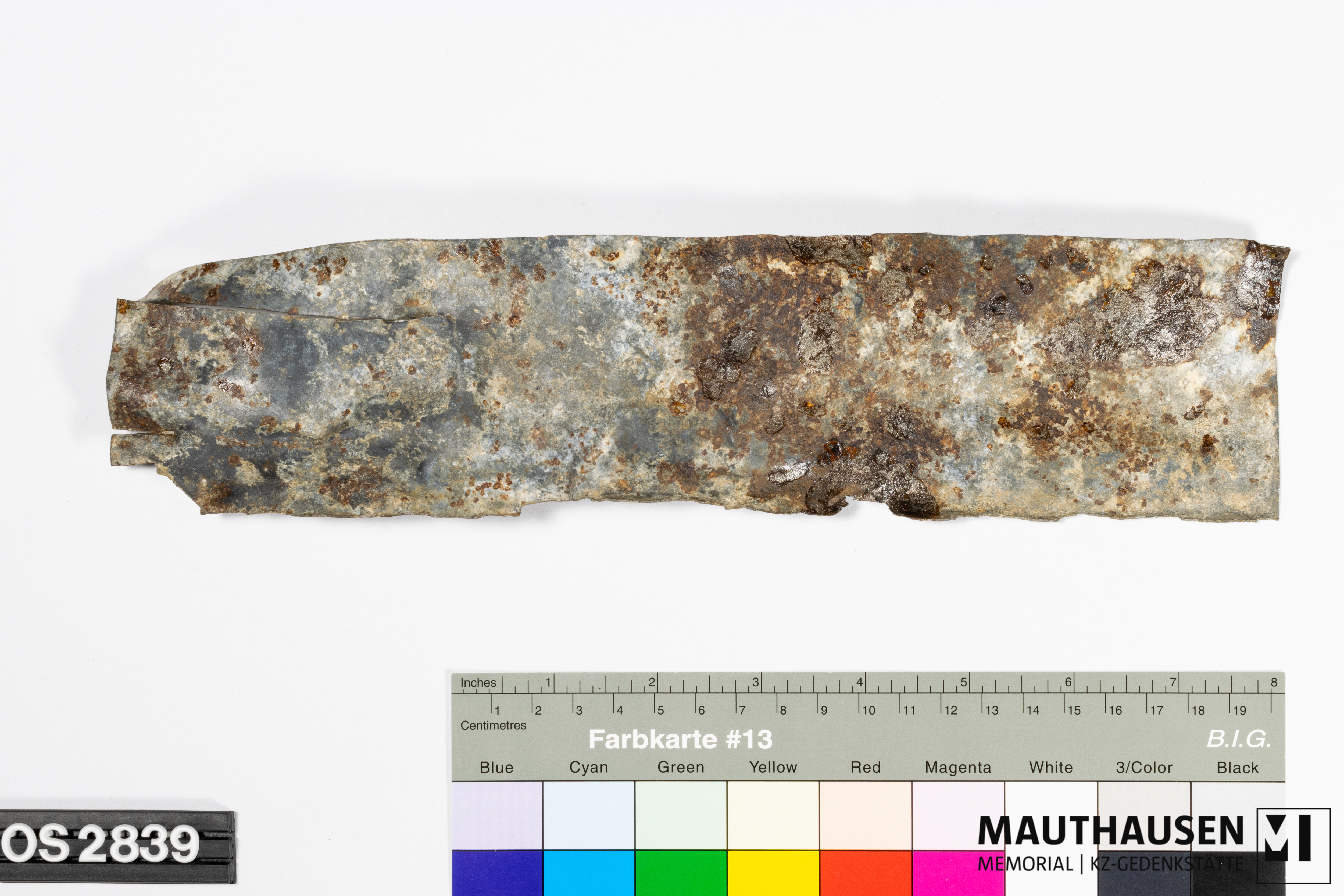 DescriptionBlech, fragmentiert; Ober- und Unterkante stark ausgefranste Schnittkanten, Spuren von Schnitten einer Blechschere; bis zu 85mm lange Einschnitte auf der linken Seite (vom Objekt aus gesehen), umgebogene Enden