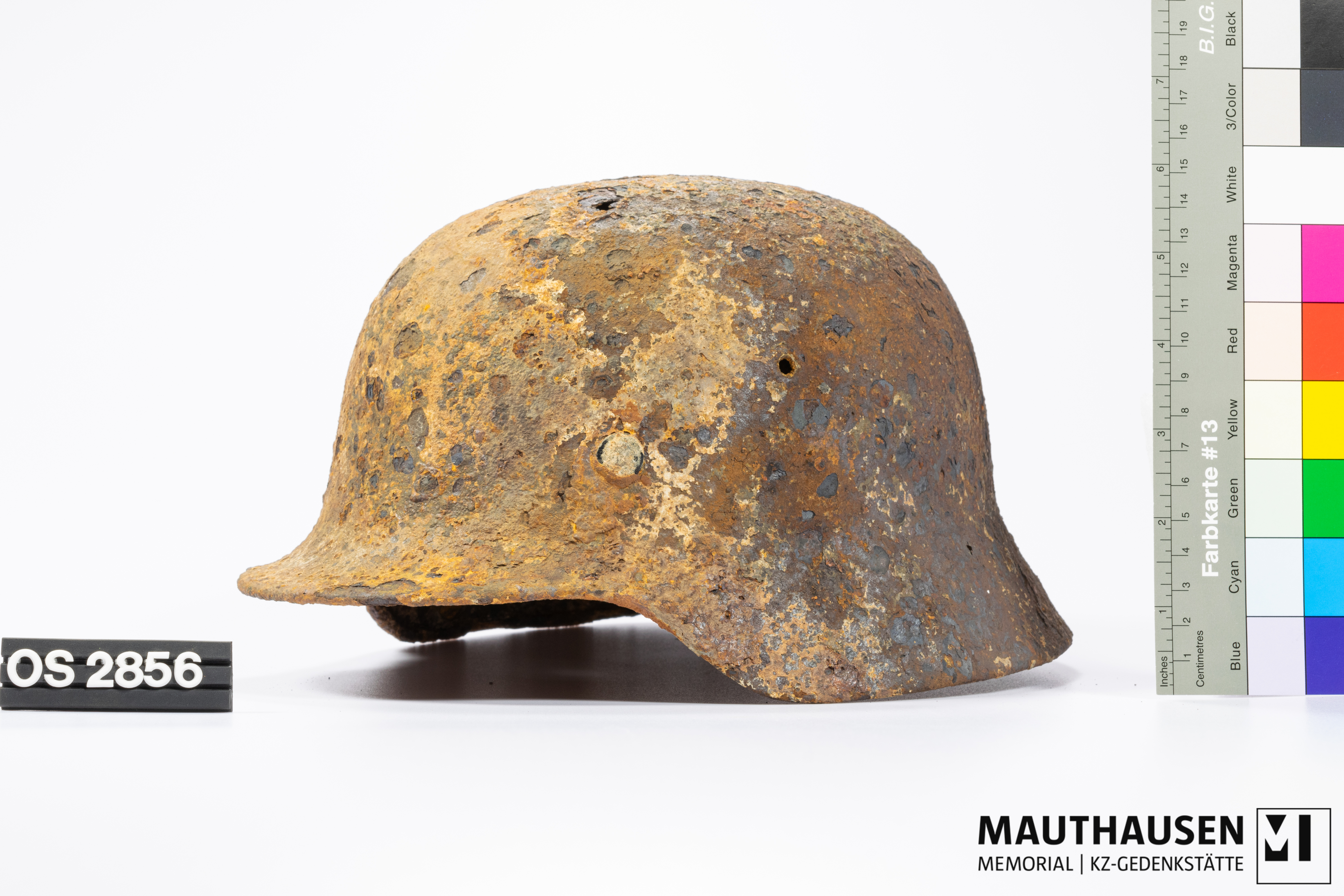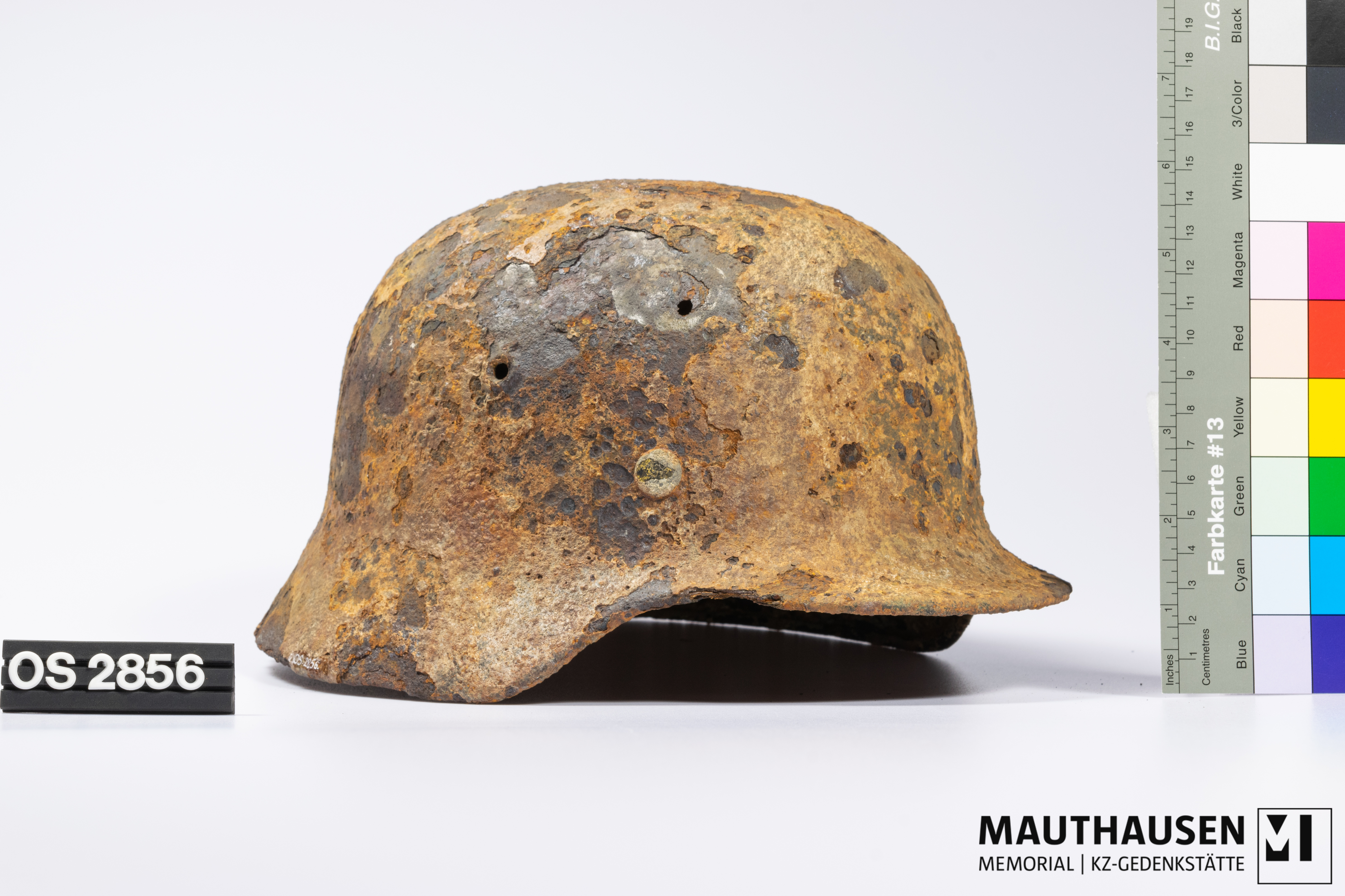 DescriptionHelm; leicht nach außen gehender Nackenschirm; nach oben aufgebogen Vorderseite; je ein Loch pro Seite, parallel zueinander, Durchmesser 6mm, von erhöhtem Rand umgeben; vorne beidseitig kreisrunde Messingknöpfe, rechts (vom Objekt aus gesehen) ca. 30mm vom unteren Rand entfernt, links ca. 35mm; Band auf der Innenseite möglicherweise zur Größenverstellung; Helm vermutlich älter als OS2855