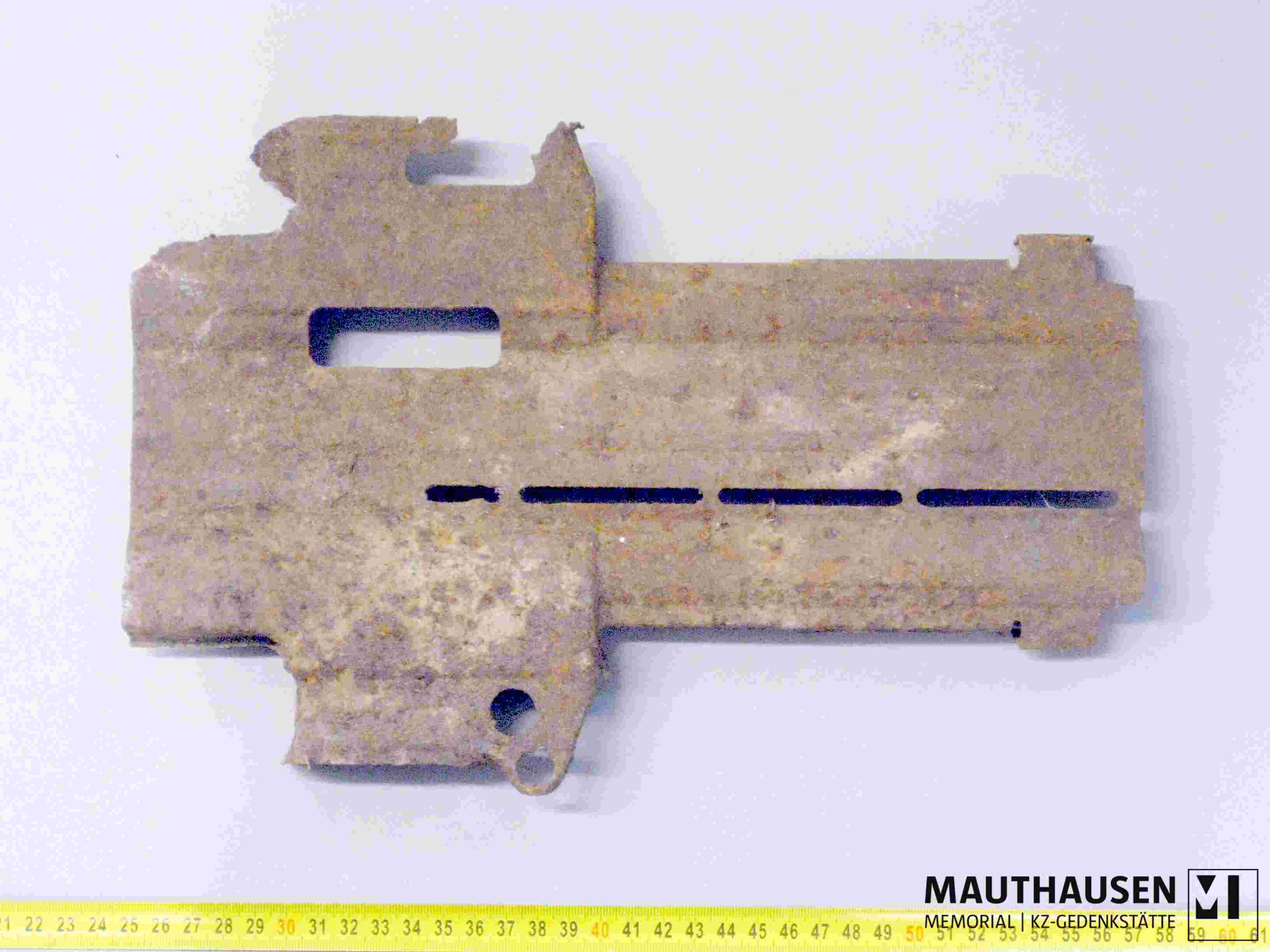 Descriptiongestanztes Blech, für Maschinengewehr; starke Oberflächenveränderungen/Rost; scheint, als wäre ein Stück Metall ausgerissen