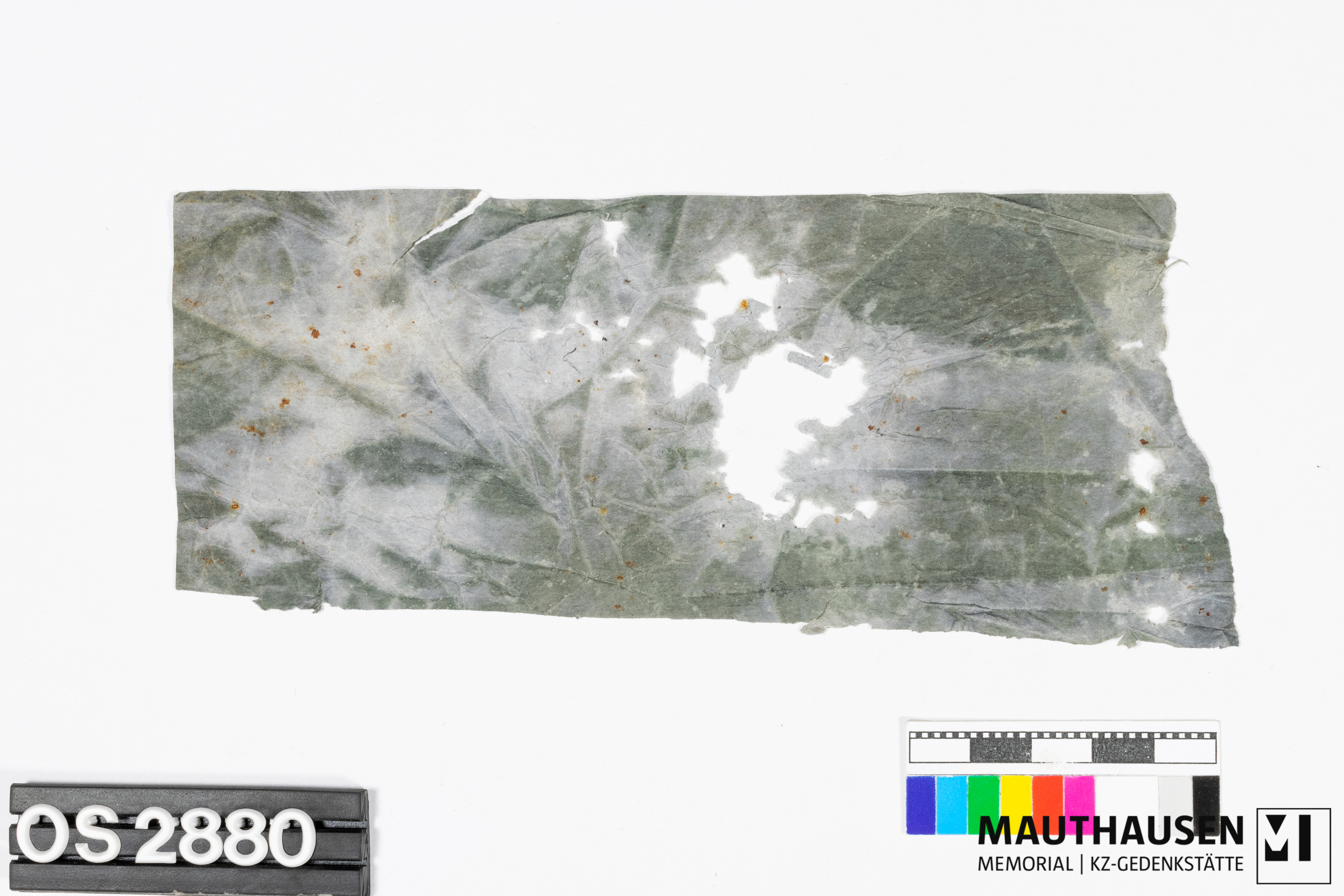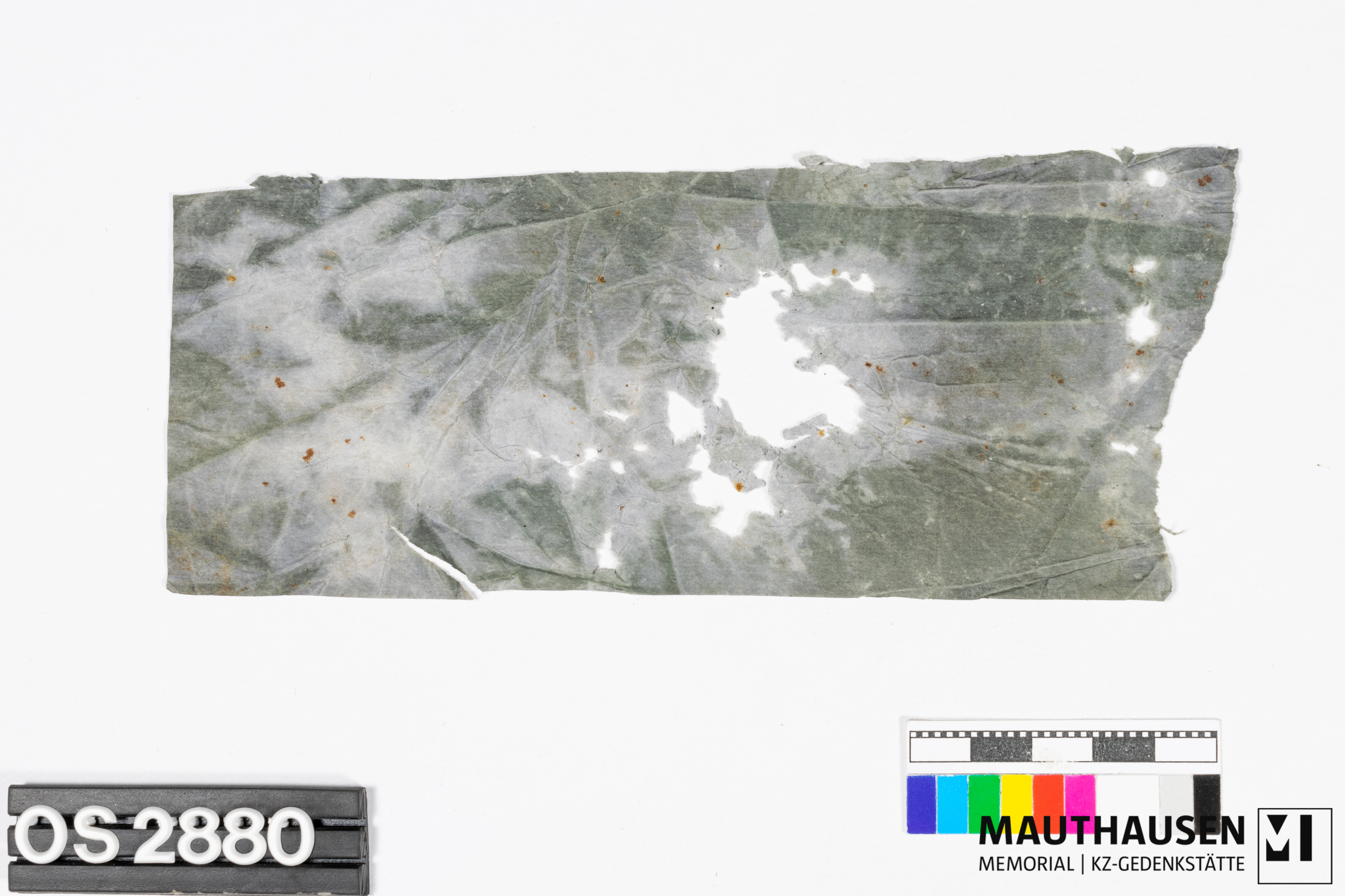 DescriptionPapier, Papierstreifen aus einer Herrenjacke, fragmentiert; kein sichtbarer Aufdruck, löchrig; blau-grau;