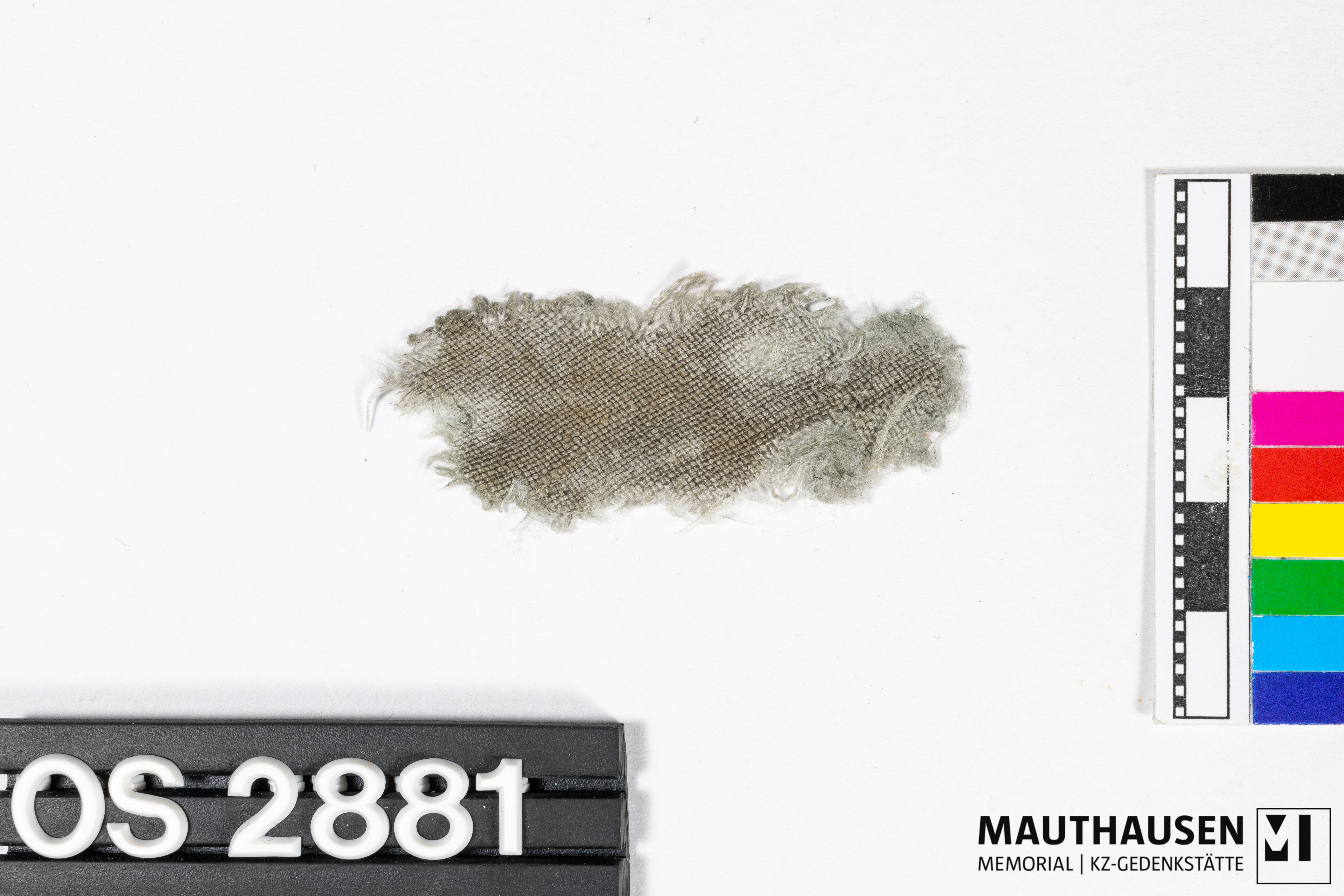 DescriptionTextil, fragmentiert; Fragment eines Leinenstoffs aus einer Jacke; Leinwandbindung, fein; Kette und Schuss: 20:20 Fäden/cm, grau
