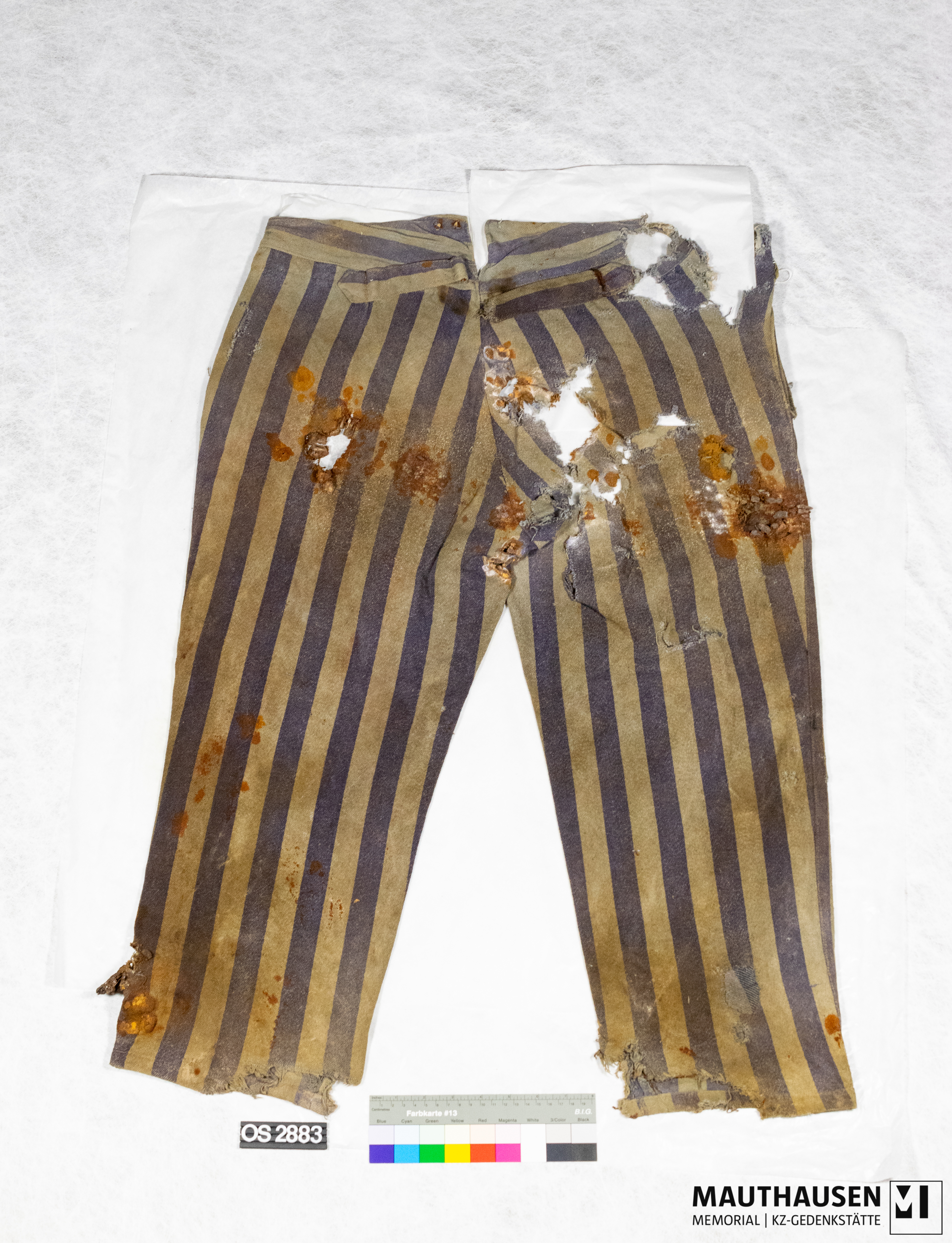 DescriptionOS2883a: Hose; 2 Hosenbeine, Schrittlänge 340mm; Bundweite 1000mm, b=60mm, an Vorderseite durchgehend angeschnitten; ein Knopflochverschluss, v-förmig; ab Seitennaht extra angesetztes Rückenteil (l=250/230mm, b=25/110mm); 2 rostige Reste von Knöpfen an der linken Oberkante (vom Objekt aus gesehen); rechts Reste des Nähfadens; 2 aufgenähte Gürtelschlaufen(45 und 50mm); Hosenschlitz 240mm lang, 3 Knöpfe; Untertritt extra, bis Taille hochgezogen; rückseitig 2-teilige Schließe: l=160mm, b=30-40mm, Ende abgerissen; Schließe fehlt; 2 Seitentaschen aus Baumwollköper (270x170mm), oben entlang des Bundes bis zur Seitennaht mitgenäht; Bundfutter, Untertritt des Hosenschlitzes und Taschen aus hellem Baumwollköper; mittig am linken Hosenbein in Kniehöhe Flicken angebracht (80x40mm), blau-weißer Köper; Baumwollstoff der Hose nicht ident mit Flicken oder OS2879); am rechten Hosensaum neben Seitennaht handgenähte Flickstelle (50x40mm); lange Schlingen aus hellem 8-fachen Baumwollfaden; handgenähte Fixierung der Stoffkante am Hosenschlitz-Übertritt; Leinwandbindung Kette und Schuss: 12:8 Fäden/cm; OS2883b: Knopf, extra beigelegt.