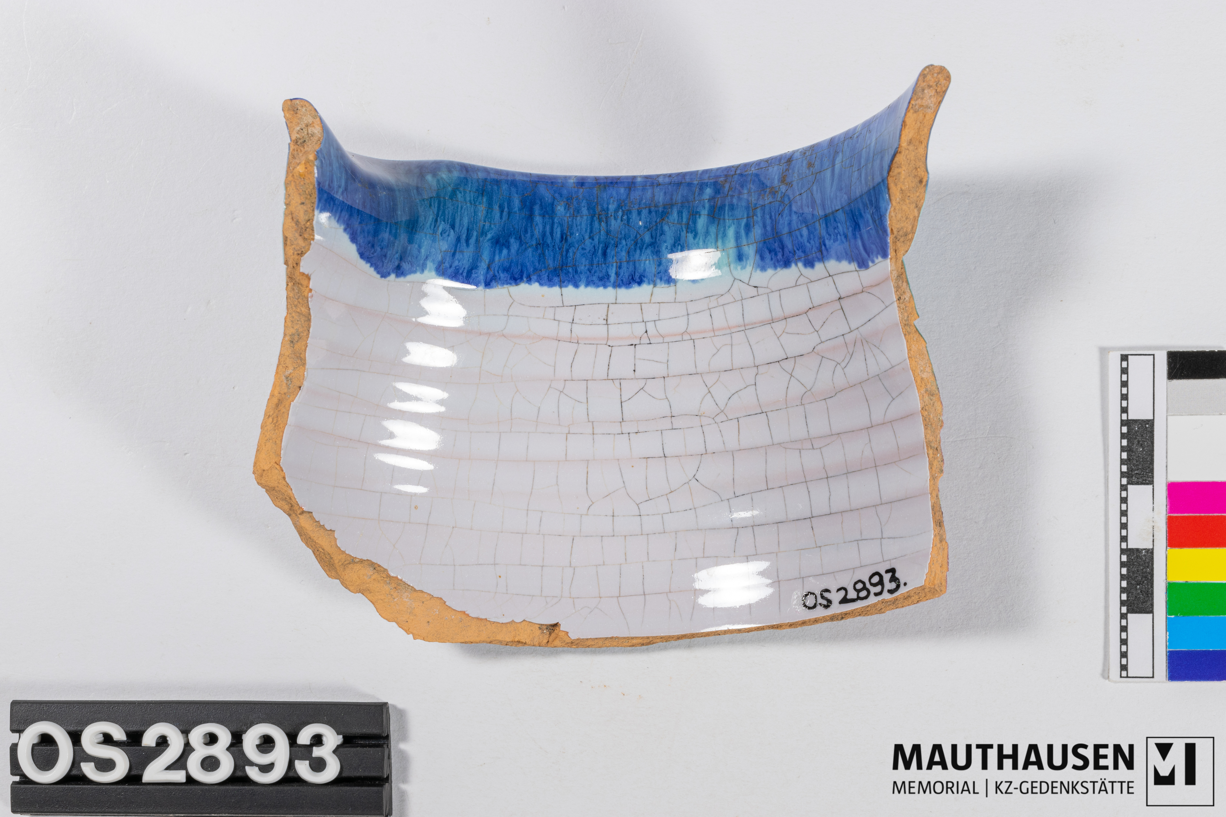 DescriptionKanne; Randfragment mit fragmentiertem Ausguss; oberer Rand innen und außen blau, verlaufende Farbe; folgend grün-weißer Farbverlauf, grüne Blätter auf weißem Grund mit schwarzen Ästen/Stängeln; rote Blume am rechten äußeren Rand (vom Objekt aus gesehen), fragmentiert; Blütenkopf gelb/grünlich, rundherum braune Punkte; innen unterhalb des blauen Rands weiß; gerillt